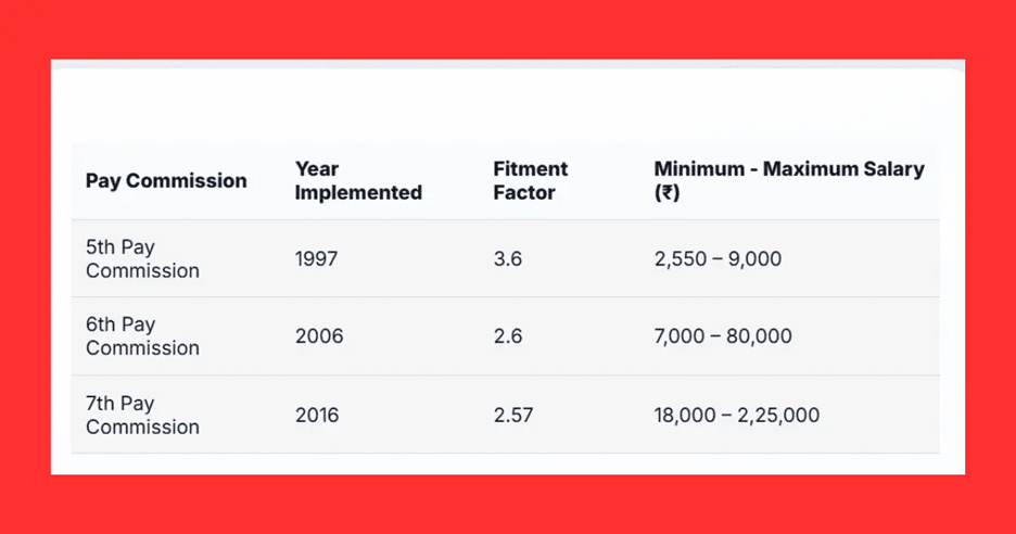 अगर हम पुराने, जो इससे पहले के जितने भी Pay Commission रहे हैं, उनको देखो, तो आप नीचे देख सकते हैं, First Pay Commission से 7th Pay Commission तक कितना Fitment Factor रहा हैं –